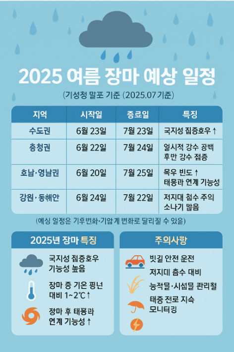 2025년 장마는 평년보다 늦게 시작할 가능성이 크며, 국지성 집중호우와 고온다습한 기후가 동시에 나타날 것으로 보입니다.