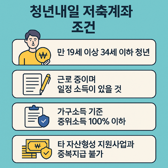 2025년 현재, 청년내일 저축계좌 신청은 만 19세 이상 34세 이하 근로 청년이 대상이며, 가구 소득이 기준 중위소득 100% 이하여야 지급 대상에 해당됩니다.